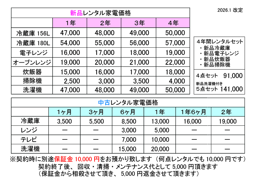 なお、保証金はお一人様につき10,000円です。例:単品冷蔵庫と単品電子レンジを注文→保証金は10,000円です。